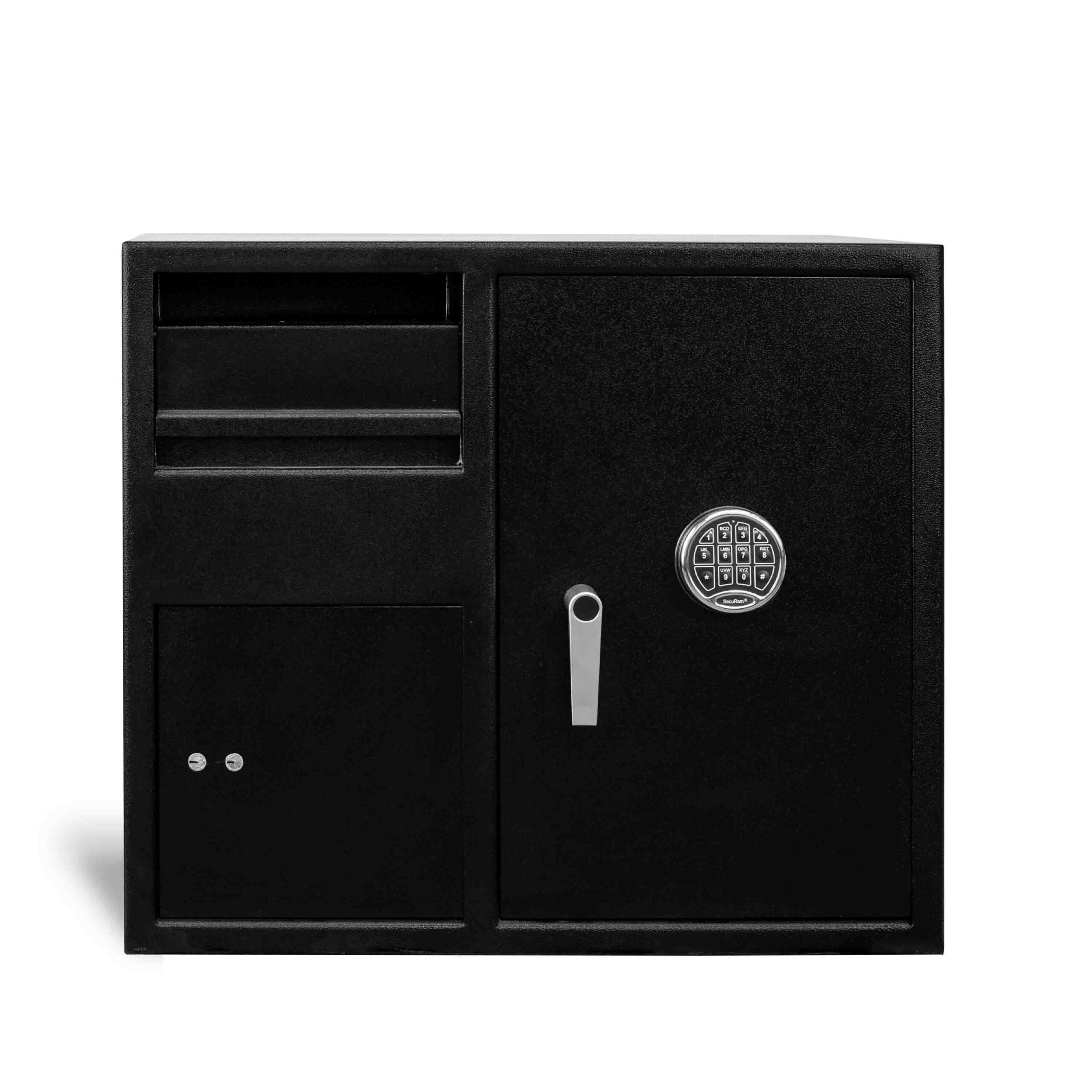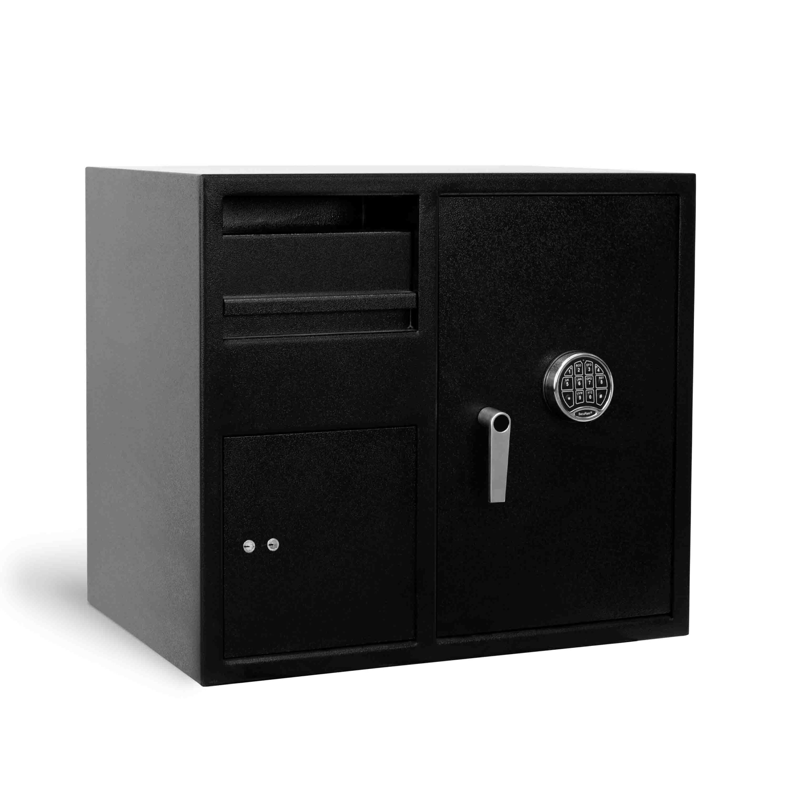 This model safe catches deposits in the top compartment, but has an extra compartment below for a change fund, keys, or other items. Our proprietary commercial design is very resistant to pry attack.