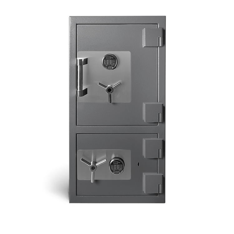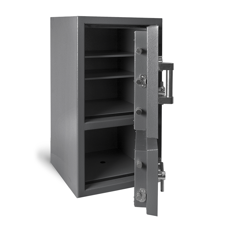 The body and door of our TL-30 safes are constructed of hardened steel, high-pressure concrete, and other proprietary hard-to-drill products. The body is 3″ thick and the doors are 5-1/4″ thick. The top door is protected by six 1-1/4″ thick bolts (3 active), and the bottom door has 4 1-1/4″ bolts (2 active).